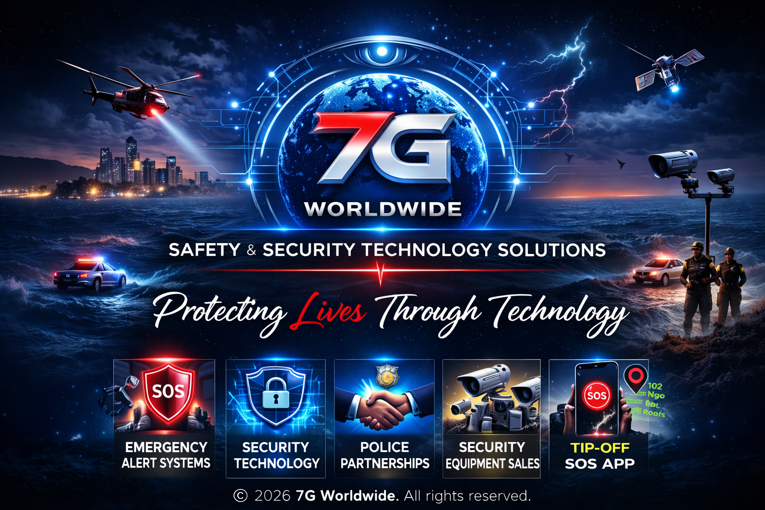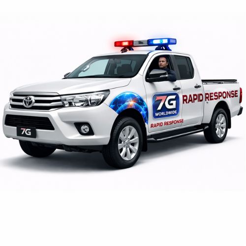 Official images of Tip-Off SOS emergency platform, rapid response vehicles, and professional security equipment deployed by 7G Worldwide.